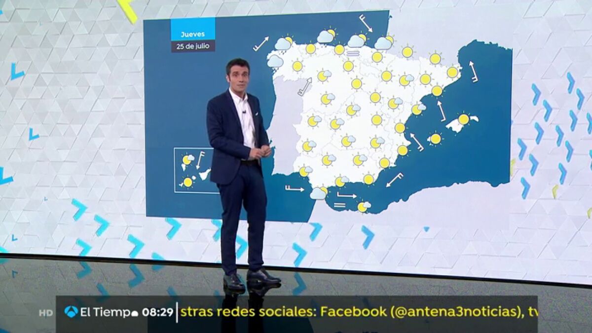 Según la Agencia Estatal de Meteorología (EAMET), el noroeste peninsular contará con un aumento de nubosidad y de precipitaciones en algunos puntos de Galicia y el Cantábrico. Habrá posibilidad de fuertes tormentas en el Cantábrico occidental. El área mediterránea se mantendrá poco nuboso o despejado, pero en el resto de la Península habrá intervalos nubosos que podría dejar algunas tormentas que podrían ser localmente fuertes en puntos de Aragón y de Navarra. En Canarias, el tiempo se mantendrá estable con algunos intervalos nubosos en el norte de las islas.