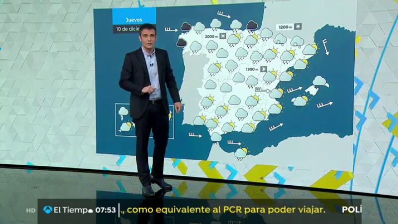 Un frente atlántico atravesará la Península y Baleares dejando cielos nubosos o cubiertos y precipitaciones en gran parte del territorio. Se esperan lluvias abundantes en Galicia, Cantábrico, alto Ebro, Pirineo occidental, Navarra y noroeste de la meseta Norte, así como en los sistemas Central e Ibérico, sierras del sudeste y Estrecho.