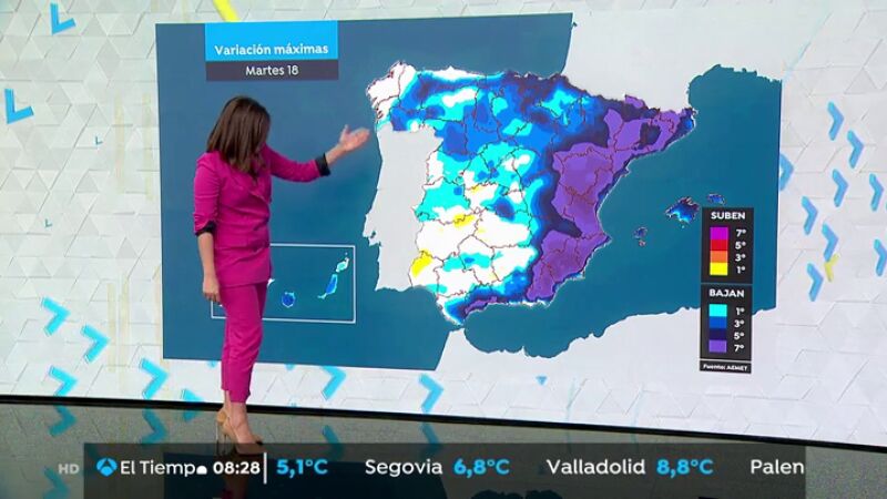 No se descartan algunas precipitaciones débiles y dispersas en otros puntos de la meseta Norte y del sistema Central. Intervalos nubosos en el resto de la mitad noroeste peninsular, que se irán extendiendo hacia el este, aunque en el área mediterránea sólo se esperan algunas nubes medias y altas.