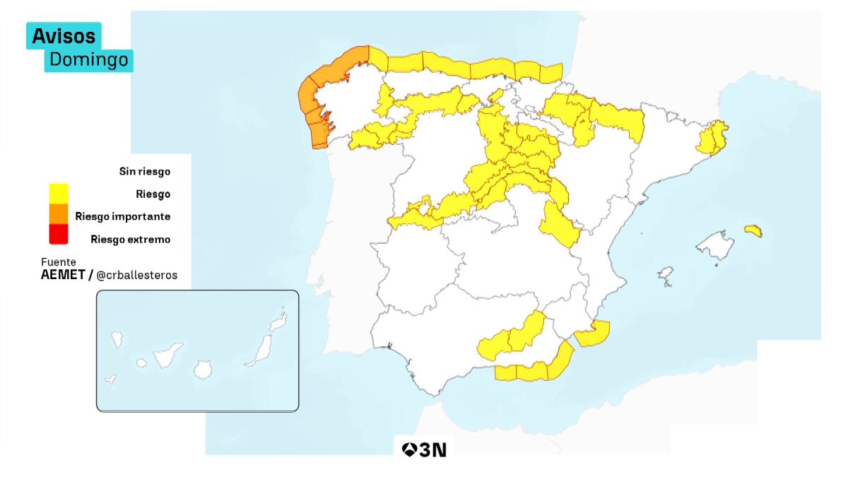 Este sábado la Agencia Estatal de Meteorología ha activado los avisos naranjas en gran parte de la Costa Gallega por fenómenos costeros, mientras que otras seis comunidades autónomas y la Ciudad de Melilla permanecen en aviso amarillo por distintos fenómenos meteorológicos adversos.