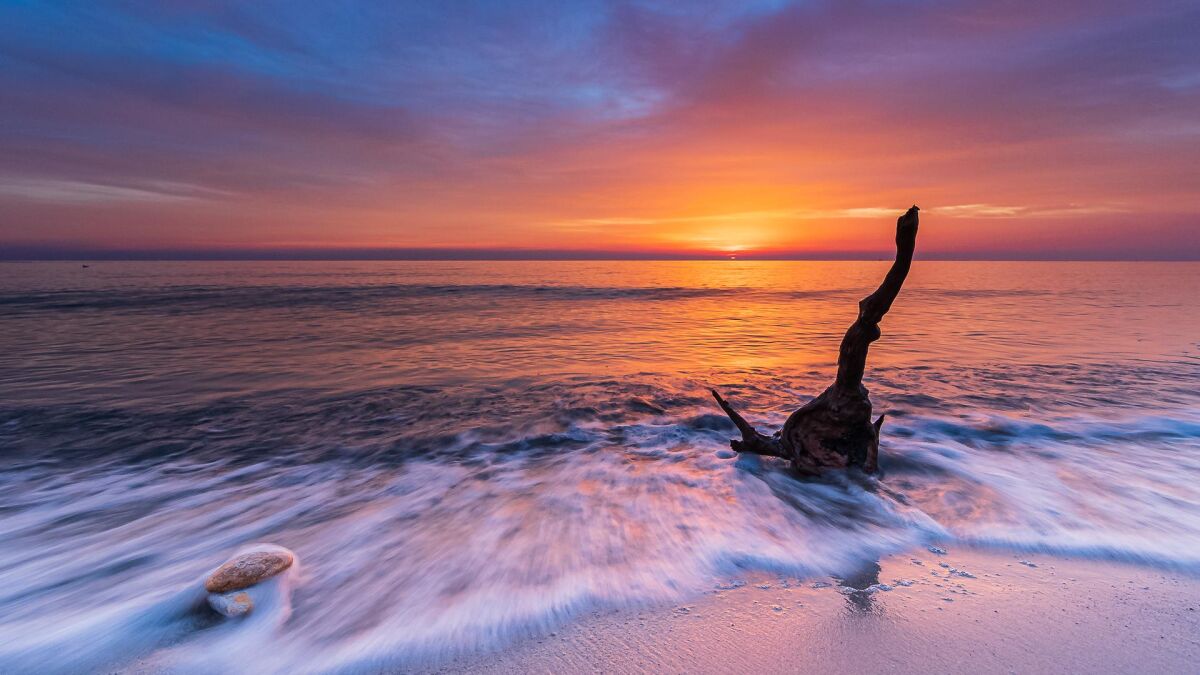 La fotografía muestra el mar en calma al caer el sol, con un cielo que se funde en tonos anaranjados, rosados y violetas. En primer plano, se pueden ver a las olas acariciando la orilla, que dejan atrás a la luz cálida del ocaso, y que convierten el paisaje en una estampa hipnótica.