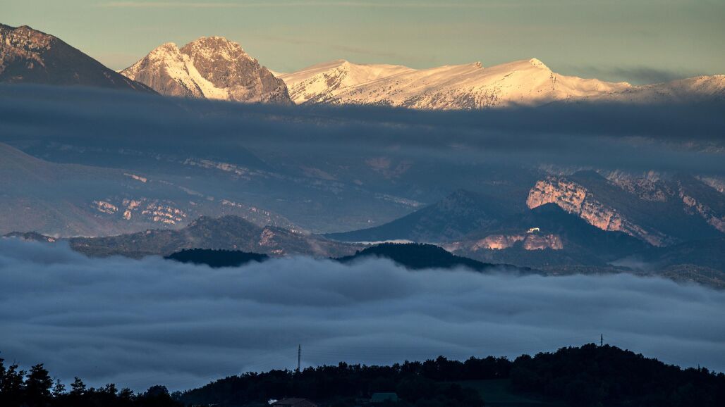 La fotografía muestra un mar de niebla cubriendo los valles, mientras las cimas nevadas se muestran llenas de luz. El contraste entre las nubes bajas, las laderas oscuras y las cumbres doradas crea una escena casi onírica, un paisaje propio de una película.