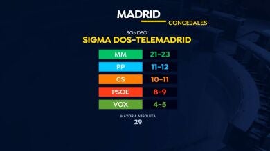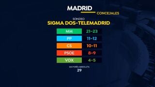 Según el sondeo de Sigma Dos, Manuela Carmena subiría entre uno y tres concejales en el ayuntamiento de Madrid, por lo que podría repetir como alcaldesa. Muy igualados estaría el Partido Popular (11-12) y Ciudadanos (10-11) con tan solo 2 concejales de diferencia.