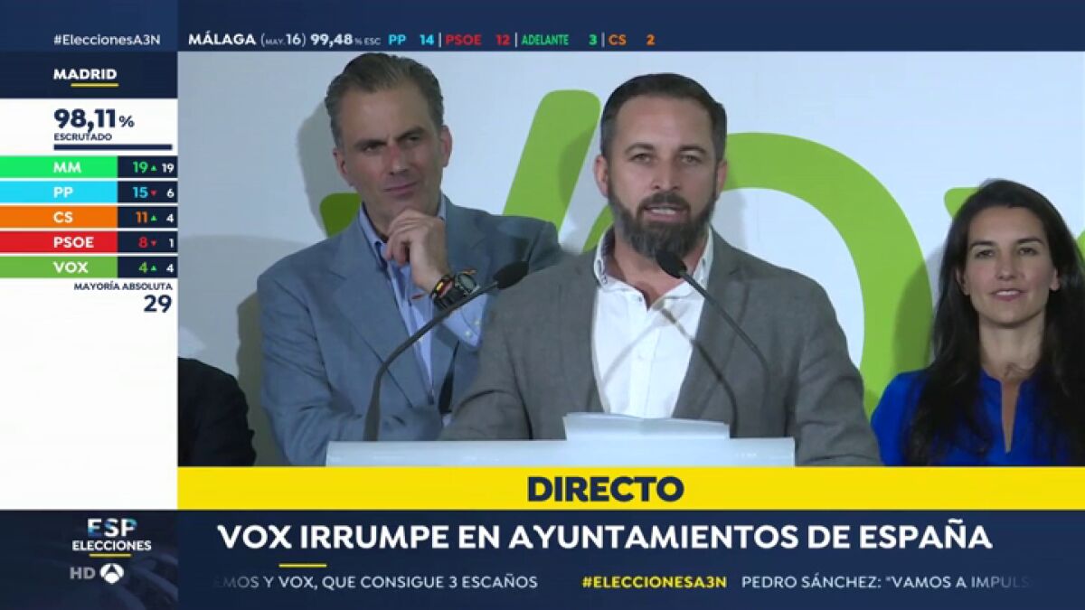 "Hoy en día hay que contar con Vox para elegir alcalde en Burgos, en Almería, en Santander, en Badajoz, en León, en Jaén y también en las ciudades autónomas de Ceuta y Melilla. Y también hay que hacerlo en Guadalajara, en Palencia, en Teruel, en Zaragoza, en Alicante, en Córdoba, en Granada y también en el Ayuntamiento de Madrid", enumeraba Abascal. "Y no solo eso, Vox es determinante en dos comunidades autónomas y ciudades autónomas: en Ceuta y Melilla; y en Murcia y en la Comunidad de Madrid para evitar que gobierne la izquierda".