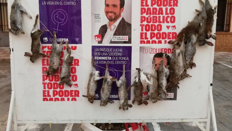 Alberto Garzón denuncia que un tablón donde lucían sus carteles electorales ha amanecido decorado con 16 conejos muertos