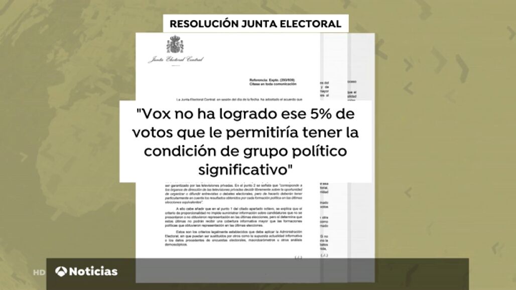 La Junta Electoral decidió este martes que Vox no era un grupo político significativo al no haber alcanzado el 5% de los votos en anteriores elecciones de ámbito nacional. Sin embargo, la ley electoral no dice nada sobre el porcentaje que debe tener un partido para estar presente en un debate, aunque habla de respetar los principios de proporcionalidad y neutralidad.