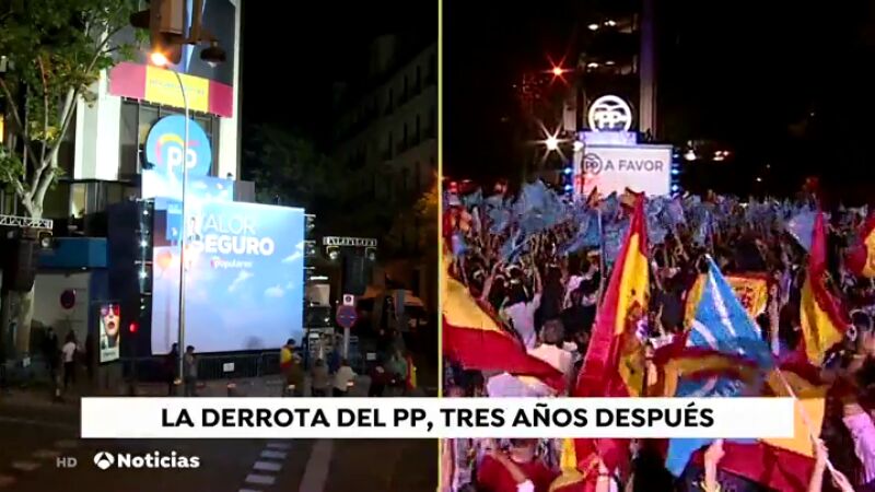 Una imagen que contrasta radicalmente con la vivida tan sólo tres años antes en la misma calle de Madrid. Tras las elecciones del 26J en 2016, España se tiñó de azul y la sede del Partido Popular acogió una enorme celebración con cientos de simpatizantes en la que el ambiente festivo y la euforia llevaron al propio Mariano Rajoy a saltar en el balcón preparado en la sede al son de los gritos de "presidente" que se escuchaban desde la calle.