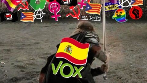 Vox ha publicado en su cuenta oficial de Twitter un polémico montaje que utilizaba una imagen de El señor de los anillos, en la que aparece Aragorn enfrentándose a los orcos. En la cabeza del luchador han colocado una bandera de España y el logo del partido; y sobre sus adversarios, la bandera republicana, el símbolo feminista y un fantasma con la bandera LGTBI, entre otros.