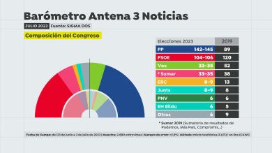 En cambio, si se hace una comparativa con el último barómetro de Sigma Dos para Antena 3 Noticias, publicado el pasado 14 de junio, el PP frenaría su subida, ya que en este sondeo se estimaba una horquilla de 144-146 diputados. Por su parte, parece que no le está yendo mal la precampaña al PSOE que logra 'rascar' algún escaño más con respecto a la anterior encuesta electoral: pasa de 102-104 a un intervalo de 104-106 escaños.