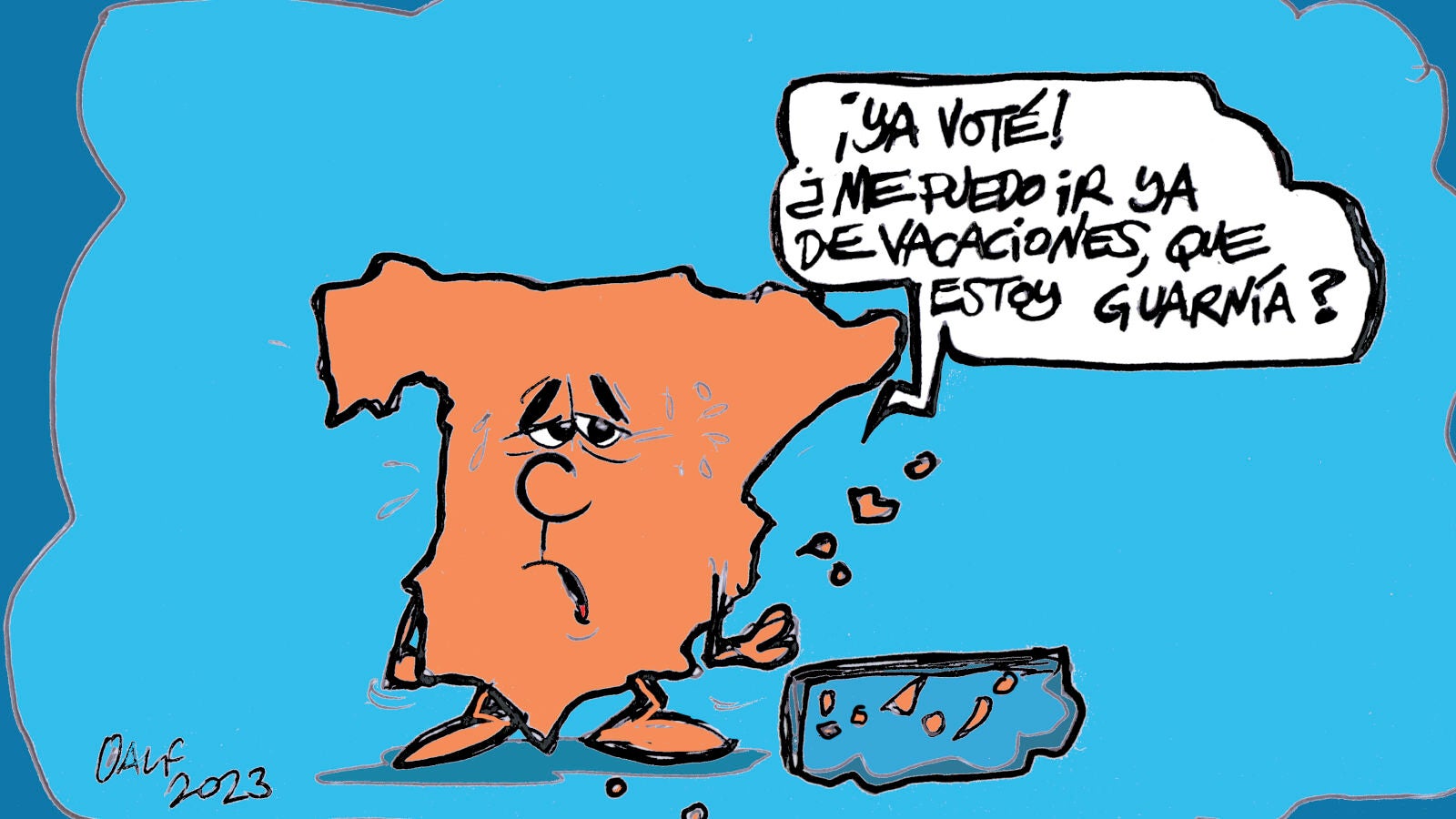 En la viñeta gráfica de esta semana, Alfredo Boto-Hervás ha plasmado la espera de las vacaciones tras las elecciones generales. En ella, de fondo azul con tonos claros y oscuros, aparece España con un aspecto cansado.