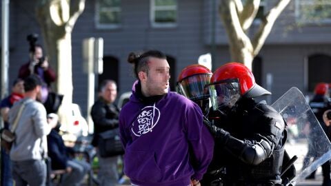 Los incidentes se saldaron también con siete contusionados, seis de ellos agentes de la Ertzaintza, y con diversos daños en mobiliario urbano, así como en un autobús, una sucursal bancaria y un concesionario de vehículos, que resultaron con cristales fracturados.