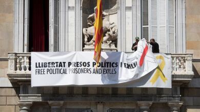 La pancarta a favor de los "presos y exiliados", con el lazo blanco y la franja roja, que colgaba desde este jueves del balcón del Palau de la Generalitat, ha sido retirada este viernes al filo de las 12.30 horas.