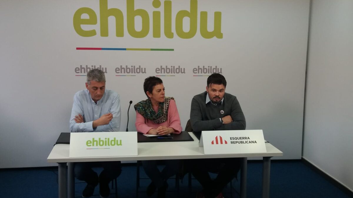El aspirante de ERC, Matute y la candidata de la coalición soberanista por Gipuzkoa Mertxe Aizpurua han comparecido este lunes en Bilbao ante los medios de comunicación para presentar el acuerdo estratégico alcanzado para las elecciones al Congreso y el Senado.