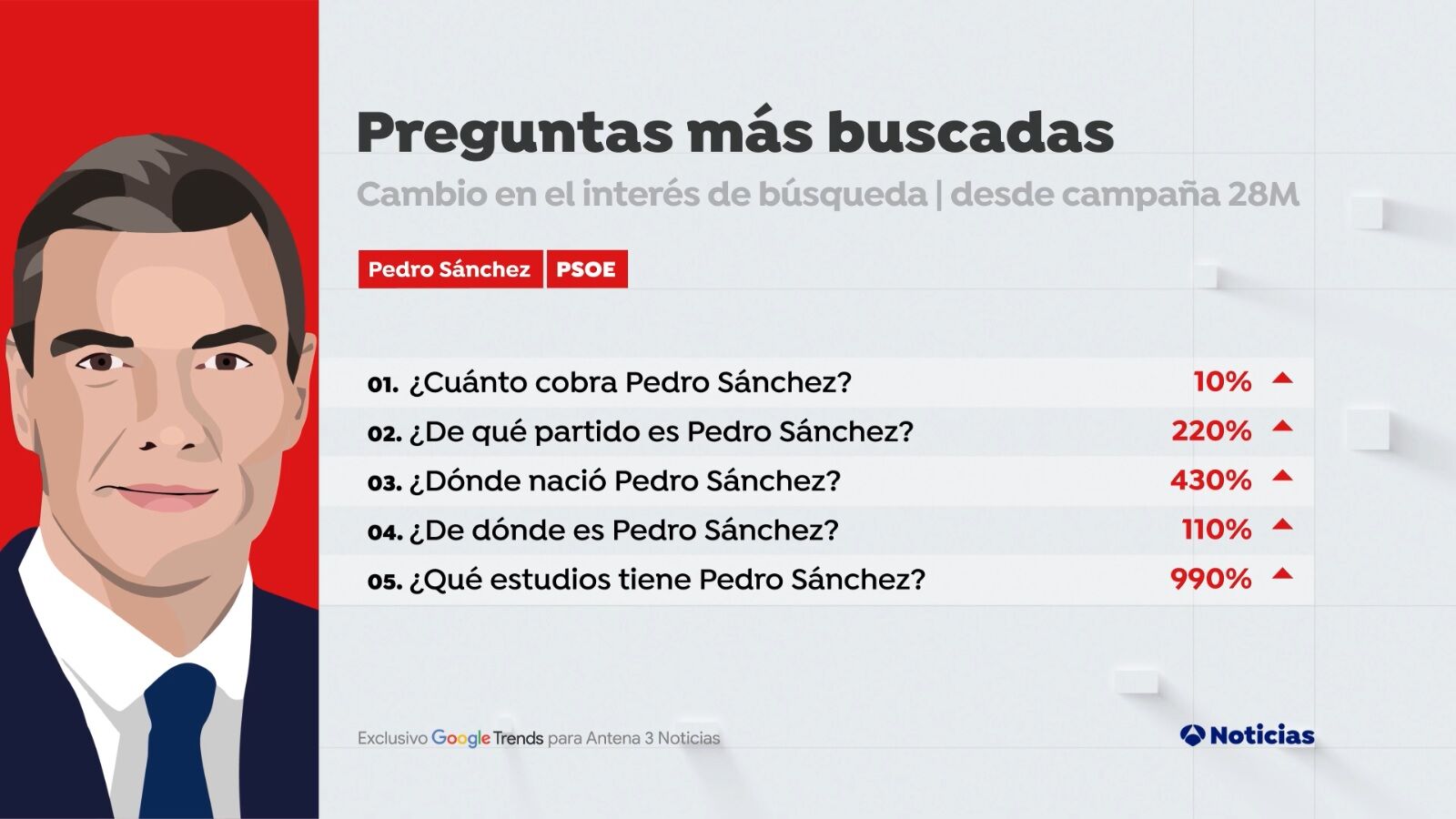 Así, temas como el lugar de nacimiento de líder del Ejecutivo, sus estudios -'¿qué estudios tiene Pedro Sánchez?'- o su sueldo -'¿cuánto cobra Pedro Sánchez?'- son de los que más interés han acumulado desde el inicio de la campaña del 28M.