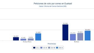 El último día para poder pedir el voto por correo fue el 2 de julio, todavía faltan algunos datos, pero hasta el momento se han registrado 16.144 peticiones (6,4% del censo) en Álava, 77.067 (8,47% del total de electores) en Bizkaia y en Gipuzkoa 32.074 (7,76% del total).