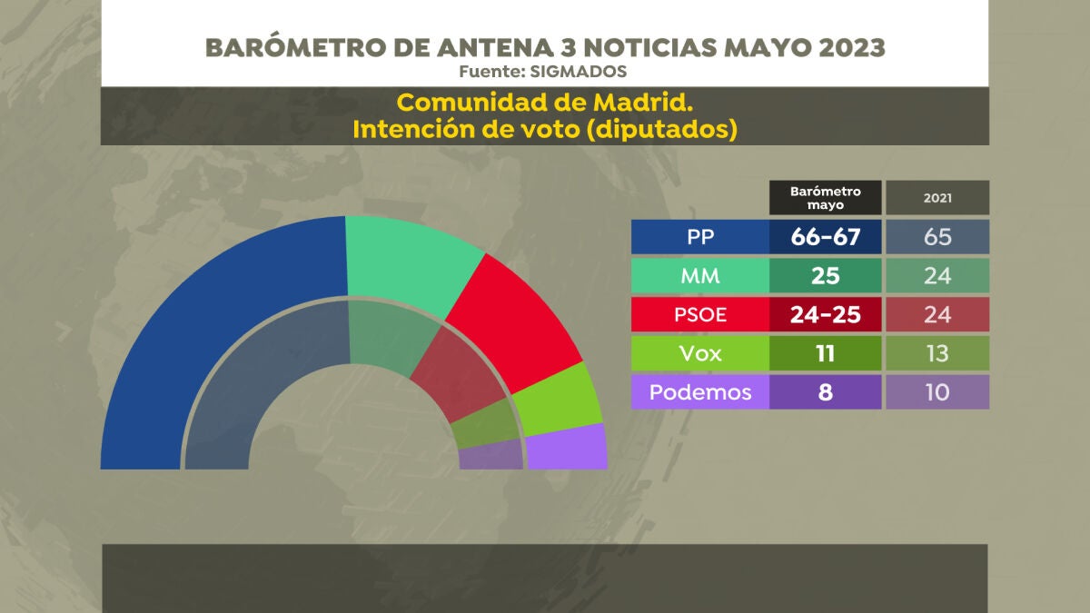El barómetro de Sigma Dos para Antena 3 Noticias señala que el PP ganaría de forma holgada las autonómicas de Madrid, aunque se alejaría de la mayoría absoluta. En el mejor de los casos, los 'populares' se quedarían a un solo escaño de los 68 que son necesarios para la mayoría, siendo determinantes los 11 parlamentarios de Vox para revalidar la victoria de Isabel Díaz Ayuso.