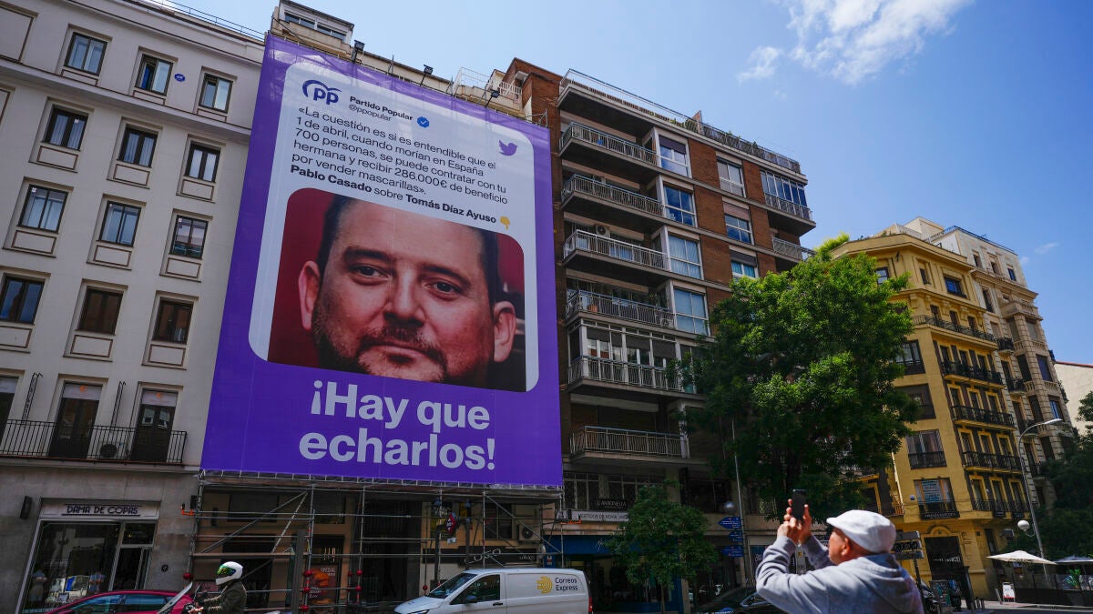 La lona, colocada por Podemos, reproduce un tuit publicado por la cuenta del PP en Twitter y que cita una frase de Pablo Casado. "La cuestión es si es entendible que el 1 de abril, cuando morían en España 700 personas, se puede contratar con tu hermana y recibir 286.000 euros de beneficio por vender mascarillas".