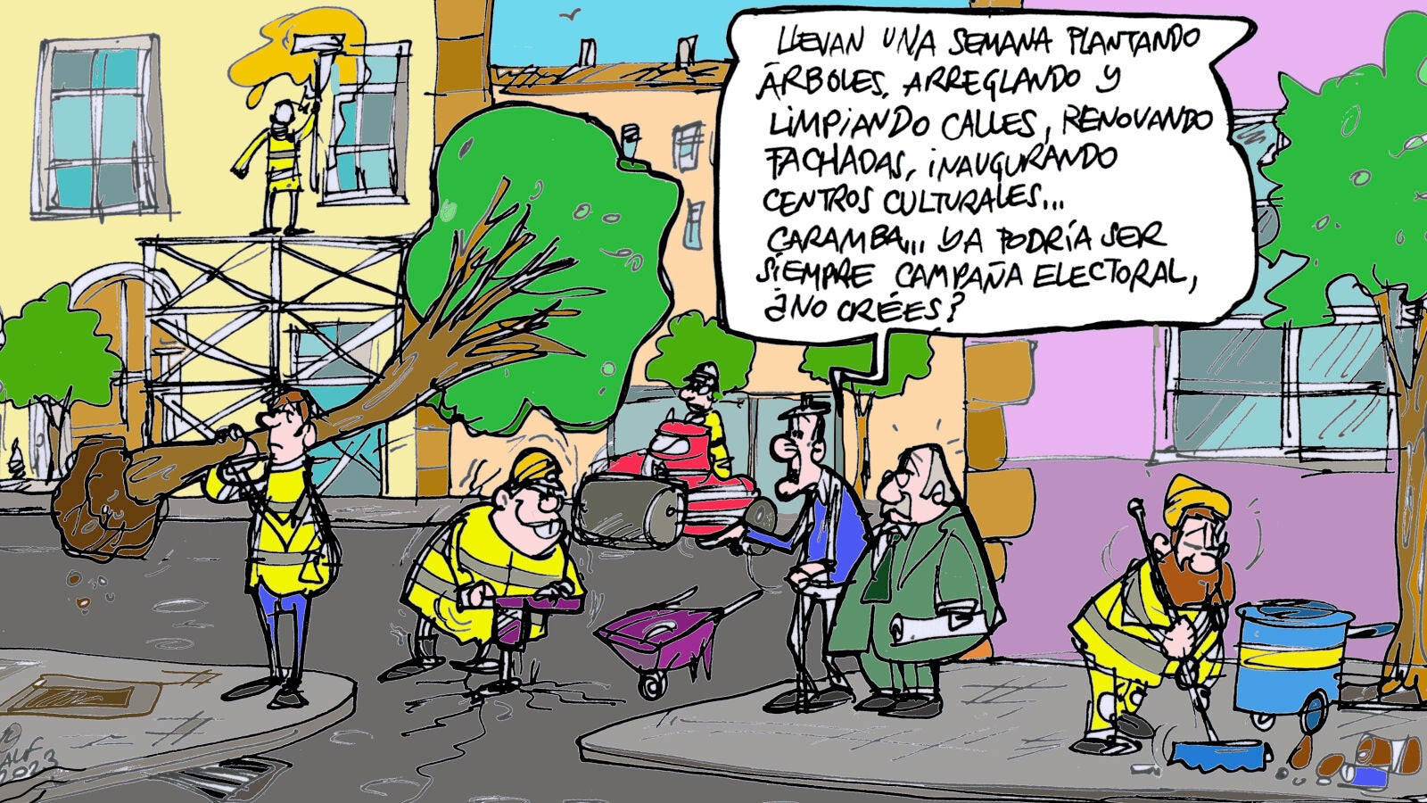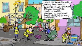 Es el último lunes de campaña y con él llega la viñeta gráfica de Alfredo Boto-Hervás, que muestra un ejemplo de las ciudades españolas que viven estos días previos al 28M. En la imagen se aprecia el arreglo en fachadas, asfaltado o la plantación de nuevos árboles.