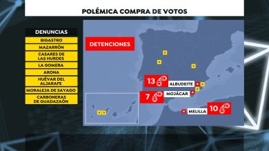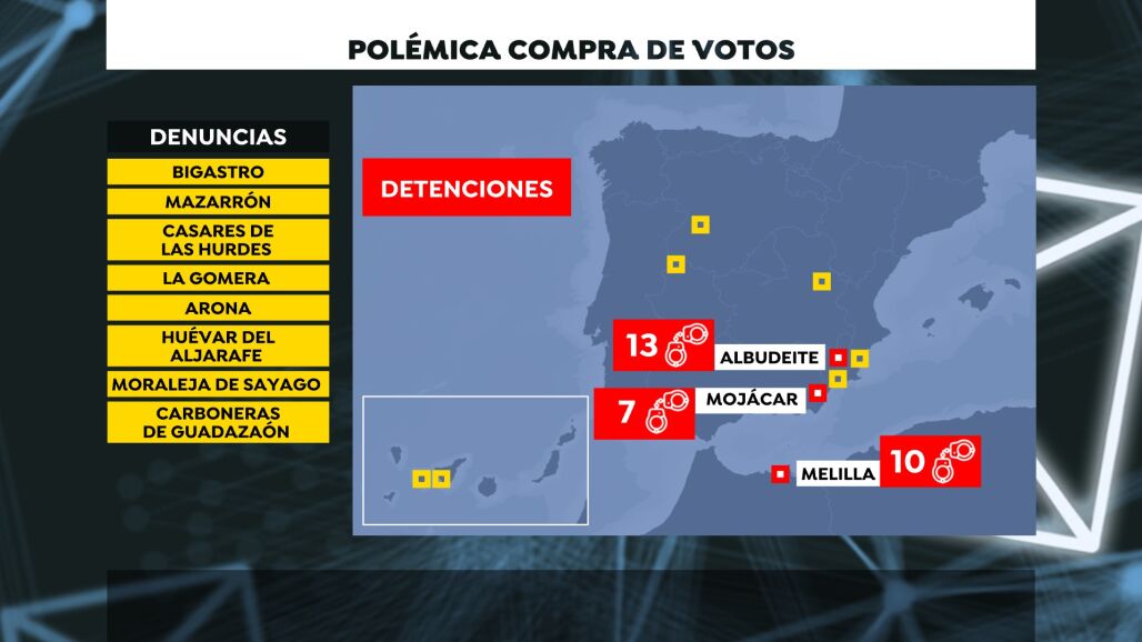 En muchos municipios hay denuncias cruzadas entre los diferentes partidos. Bigastro, Mazarrón, Casares de las Hurdes, La Gomera, Arona, Huévar de Aljarafe, Moraleja de Sayago, Carboneras, Villalba del Alcor ... son algunos de ellos y también se empiezan a conocer las primeras detenciones, 10 en Melilla, 13 en Albudeite, entre los que está la candidata socialista a la alcaldía y otros 7 en Mojácar, de ellos uno ya ha quedado en libertad provisional.