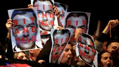 Alejados a unos 100 metros de la entrada del recinto han entonado cánticos en contra del presidente del Gobierno en funciones como 'Pedro Sánchez, no te queremos aquí' y 'PSOE y PP la misma mierda es'.