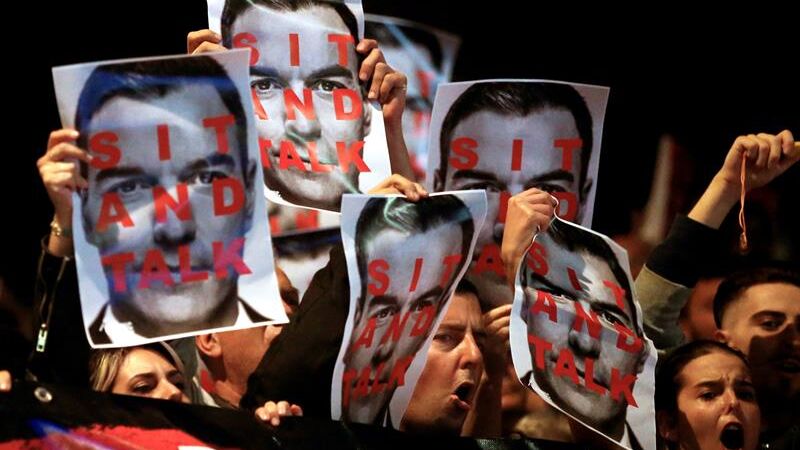 Los manifestantes han entonado cánticos en contra de Sánchez como 'PSOE y PP la misma mierda es' o 'Pedro Sánchez, no te queremos aquí'.