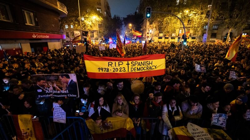 Nueva noche de manifestación en la calle Ferraz de Madrid. Y ya van catorce consecutivas. Una muchedumbre de unas 4.000 personas se ha concentrado frente a la sede del PSOE en protesta por los pactos de Pedro Sánchez con los independentistas catalanes y por la ley de amnistía. La convocatoria ha vuelto a moverse a través de las redes sociales y entre otros, por dirigentes de Vox.