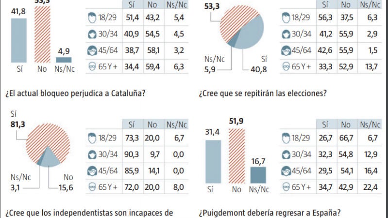 El 81,3% de los catalanes califican de "perjudicial" el actual bloqueo institucional, que para el 48% de los que respondieron a la encuesta obedece a que los independentistas "son incapaces de ponerse de acuerdo". El 40,8% de los consultados valoran negativamente la aplicación del artículo 155 y el 37,2% se muestran a favor de la formación de un gobierno de concentración.