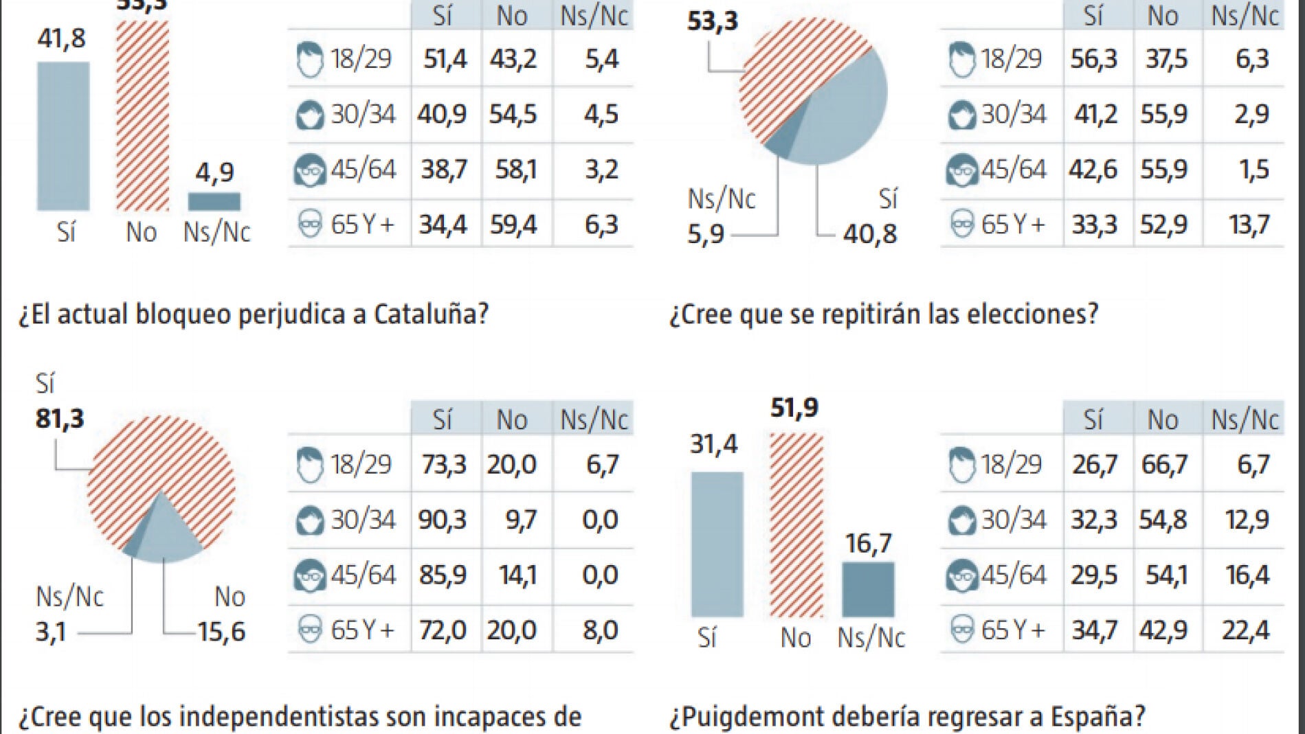 Un 53,3% de los catalanes están en contra de la independencia y un 51,9% creen que no deberían repetirse los comicios autonómicos en Cataluña, pero un 48,3% participarían otra vez en un referéndum como celebrado de forma ilegal el 1 de octubre pasado, según un sondeo de NC Report que divulga La Razón.