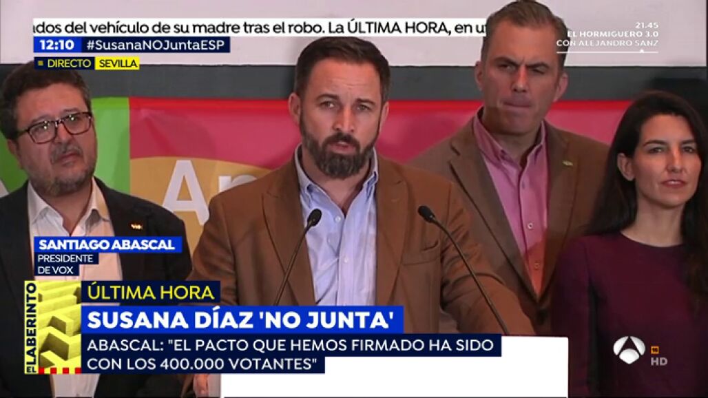 El líder de Vox, en su primera rueda de prensa, tras conocerse la irrupción de su formación en el Parlamento andaluz, afirmaba que nunca serán "un obstáculo para que haya en Andalucía una mayoría alternativa a la corrupción socialista y al 'chavismo' que estaba dirigiendo la política en este momento".