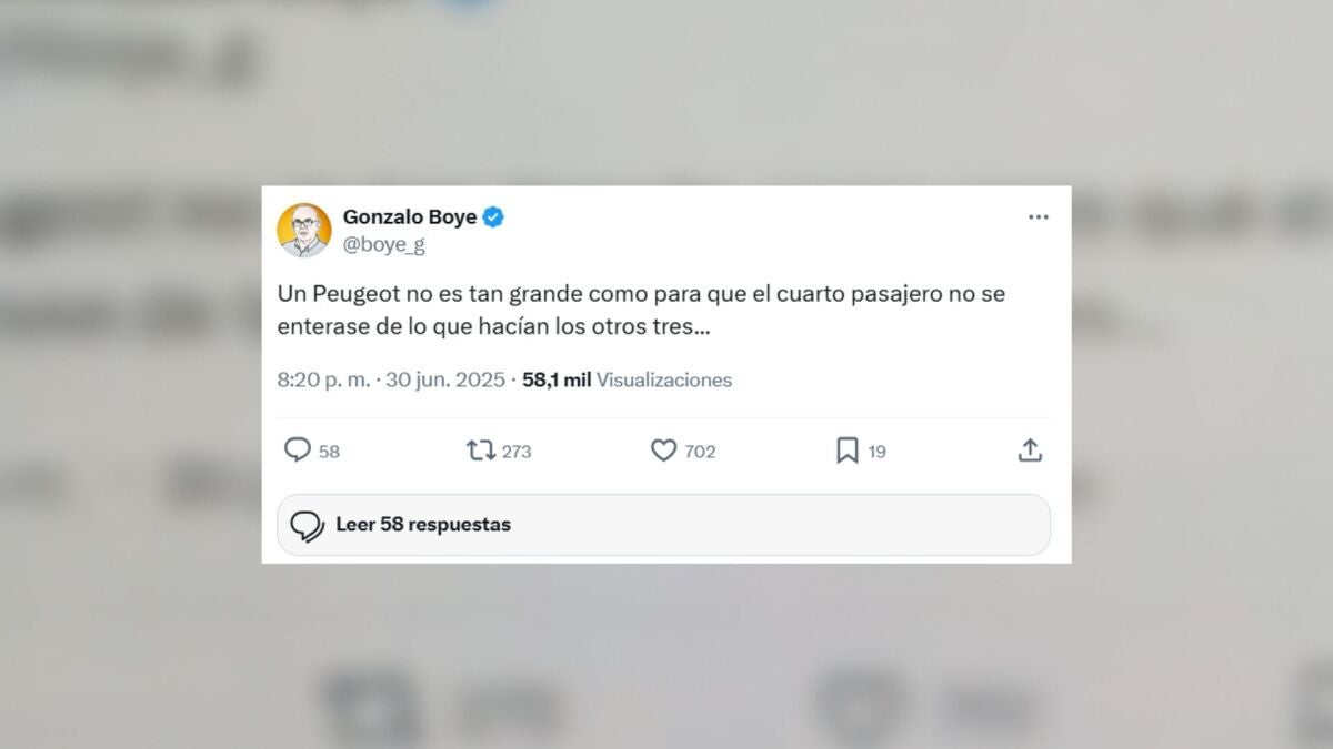 "Un Peugeot no es tan grande como para que el cuarto pasajero no se enterase de lo que hacían los otros tres…", escribió Boye en la red social. La frase, publicada horas después del ingreso en prisión de Cerdán, ha sido interpretada como una sugerencia directa sobre la existencia de un cuarto implicado o testigo clave en la trama de mordidas por contratos públicos.