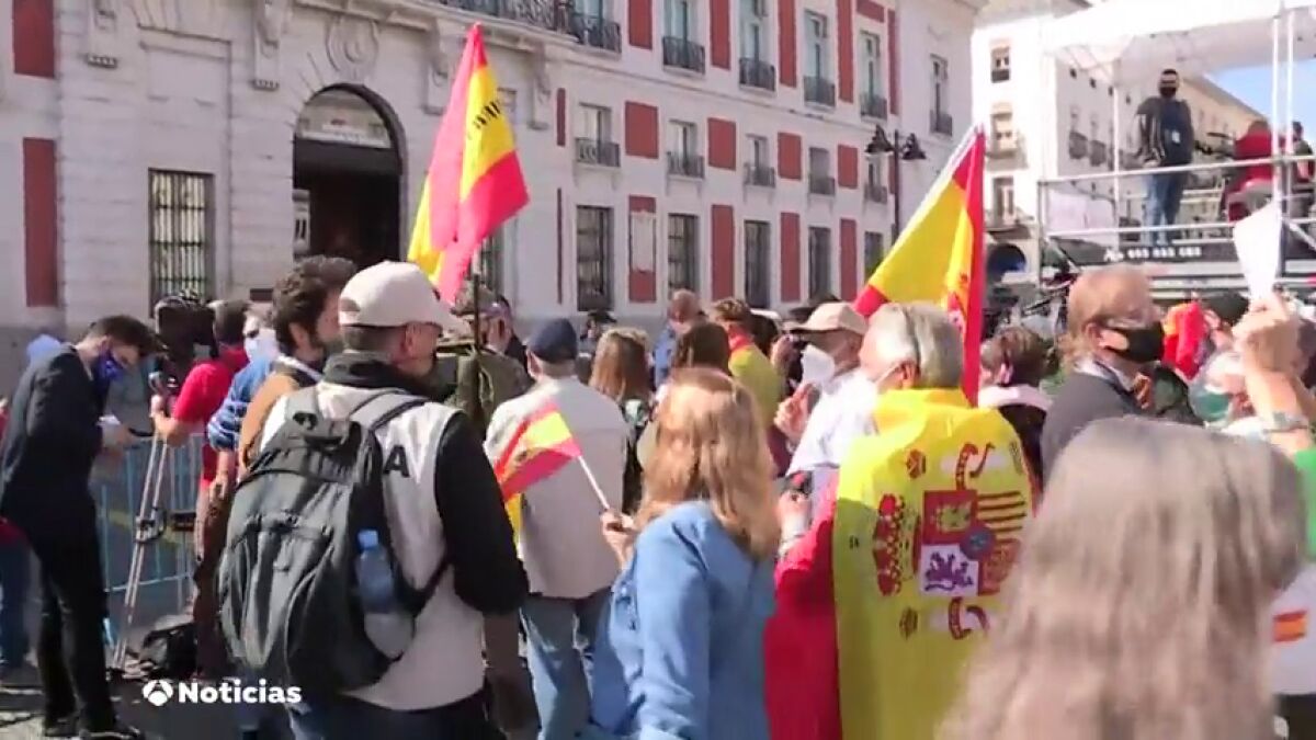 Frente a la puerta principal de la Real Casa de Correos, en la parte central de la Puerta del Sol, le esperaban con abucheos y pitidos un grupo de manifestantes concentrados en la plaza, convocados por el sindicato apoyado por Vox, 'Solidaridad', para protestar por la gestión de la pandemia por parte del Gobierno central.