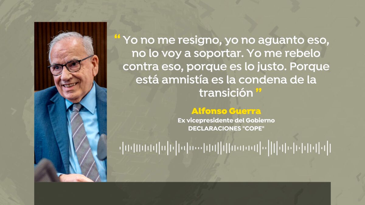 Guerra ha pedido a Pedro Sánchez que rechace la amnistía: "Me rebelo contra eso, esta amnistía es la condena de la Transición". Argumenta que la ley de amnistía que pide el expresidente de Cataluña huido en Bruselas "es negar todo lo que ha significado un esfuerzo enorme y la transición para que siguiera adelante el país" dice Guerra.