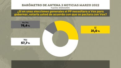 Sin embargo y pese a que una hipotética coalición entre PP y Vox es vista con buenos ojos por la mayoría de sus respectivos votantes, el grueso de los españoles la descarta. A la pregunta de "¿Si en unas elecciones generales el Partido Popular necesitase a Vox para gobernar, estaría usted de acuerdo con que se pactara con Vox?", casi seis de cada 10 (un 57,7%) responde que 'no'. Un 31,5% se inclina por el 'sí' y el restante 19,4% no sabe o no contesta.