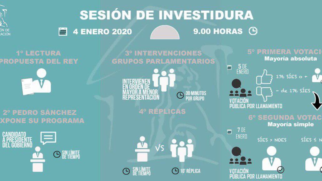 Tras el anuncio el pasado martes de las fechas del debate, la presidenta del Congreso, Meritxell Batet ha confirmado en la tarde de hoy que el Pleno para la Investidura de Pedro Sánchez se iniciará el sábado 4 de enero a las 9:00 de la mañana. Este anuncio se ha producido tras el anuncio de que Esquerra Republicana de Cataluña votará a favor de Sánchez.