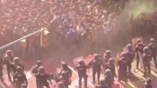 Agentes y furgonetas han quedado completamente teñidos de polvos de colores, como los que se utilizan en las fiestas indias Holi, y que los manifestantes lanzaban a presión levantando una intensa polvareda multicolor en la zona.