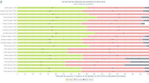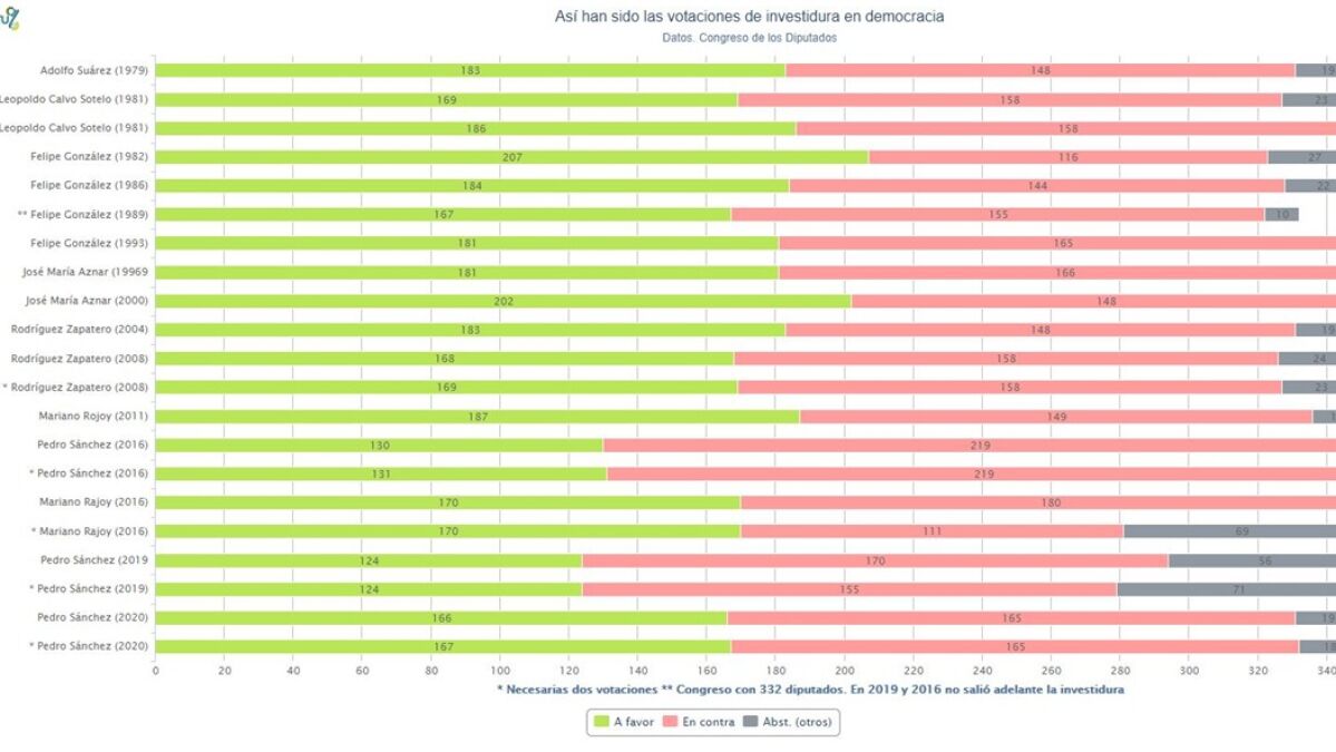 Pedro Sánchez pasa a la historia de la democracia española al convertirse en el primer presidente del Gobierno que consigue ser investido con tan solo dos votos de diferencia. Nunca antes en democracia se había dado una votación tan ajustada y para ver una situación similar habría que remontarse a 1989 con Felipe González.