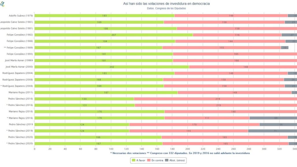 Para presenciar algo similar en sesión parlamentaria hay que remontarse hasta 1989 cuando Felipe González consiguió ser investido por 166 votos a favor frente a 155 en contra y 10 abstenciones. Sin embargo, en aquel caso había menos diputados en el Congreso. En total 332 diputados ya que se tuvieron que anular las elecciones en Murcia, Pontevedra y Melilla.