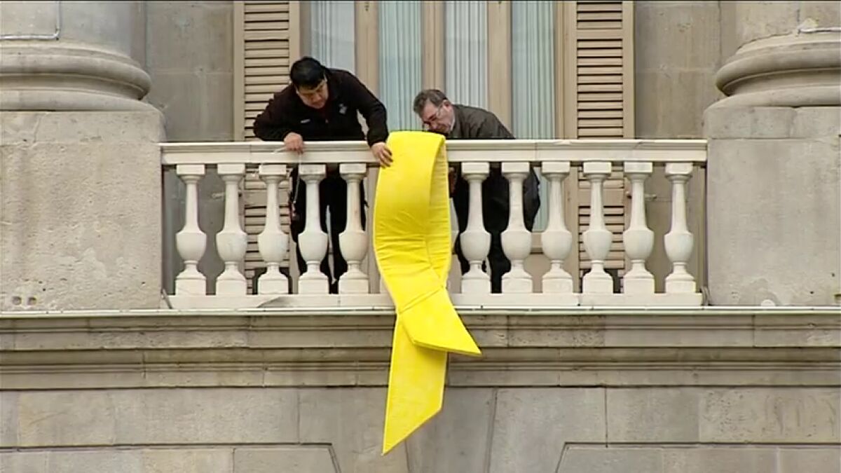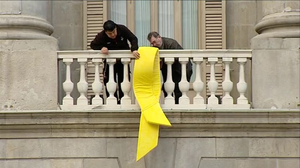El Ayuntamiento de Barcelona cuelga un lazo amarillo en su fachada para reclamar la libertad de los presos