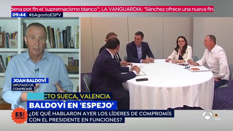 "El método es empezar con tiempo a hacer las reuniones, decirnos qué esperamos de este acuerdo y durante este semana pasarnos documentos", ha explicado Baldoví en una entrevista en Espejo Público en la que ha señalado que, si hay un gobierno, éste tendría que ser con "Unidas Podemos, Compromís, PNV y PRC". "Esa es la única opción posible, la otra opción son las elecciones", ha añadido.