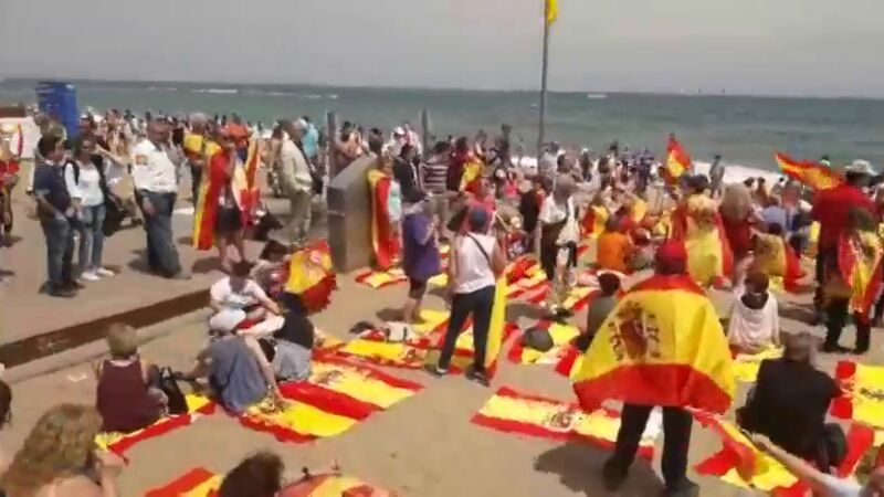 Tras la marcha, unas cien personas han acudido a la playa de la Barceloneta, donde se han repartido toallas con la bandera de España sin que se produjeran altercados. Esta imagen contrasta con la vivida hoy también en Mataró, donde las toallas eran amarillas y se han colocado en forma de cruces.