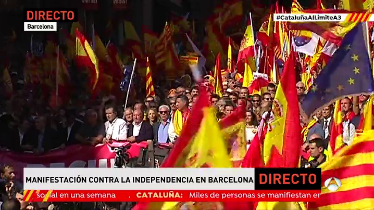 En Barcelona no cabe ni un alfiler, sobre todo en el centro, donde está teniendo lugar la manifestación masiva a favor de la unidad de España y el 'no' a la independencia de Cataluña. Banderas europeas, españolas y catalanas pueblan las calles de la Ciudad Condal y de banda sonora, proclamas de 'yo soy español', entre otras.