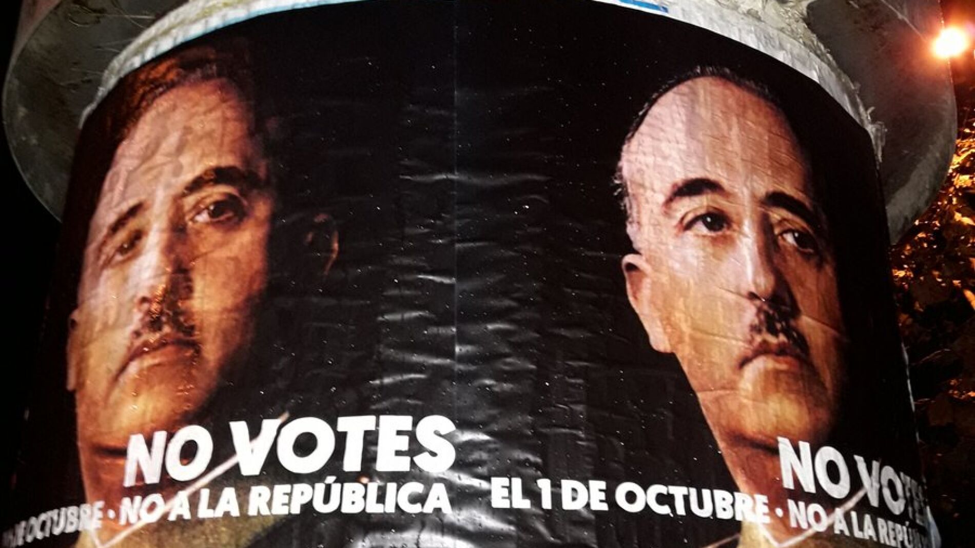 Varias ciudades catalanas han amanecido con carteles colgados en postes publicitarios o estaciones de ferrocarril, entre otros puntos, con la imagen del dictador Francisco Franco. El lema: "No votes el 1 de octubre. No votes a la República"forma parte de una campaña promovida por el grupo independentista "República des de Baix", y difundida a través de las redes sociales.