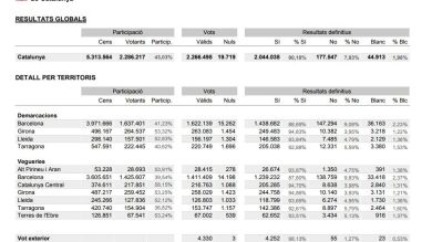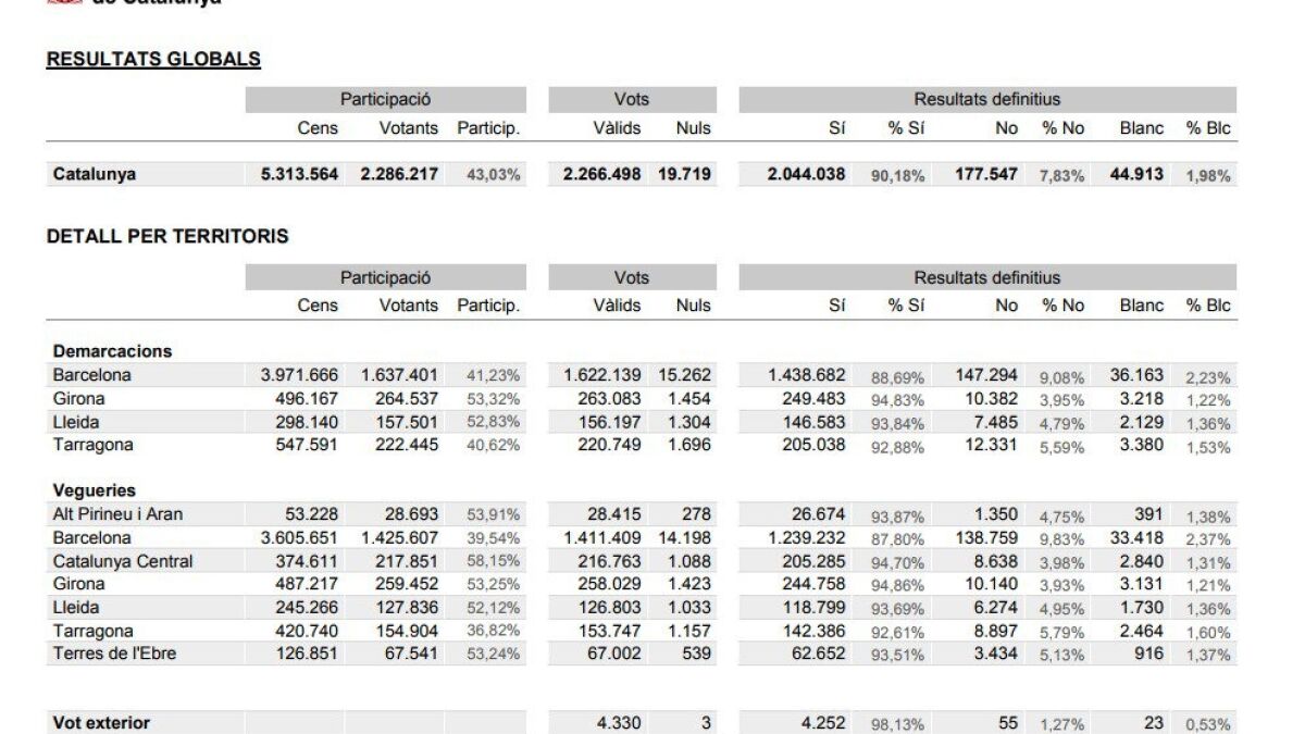 Según los datos facilitados por la Generalitat, del censo total de 5.313.564 participaron en la votación del 1-O, el 43,03% del censo, de los cuales el 90,18% votaron 'sí', 7,83% votaron 'no', y un 1,98% en blanco. El gobierno catalán ha trasladado ya al Parlament estos resultados definitivos en su calidad de administración electoral de Cataluña, después de que disolviese la Sindicatura Electoral.