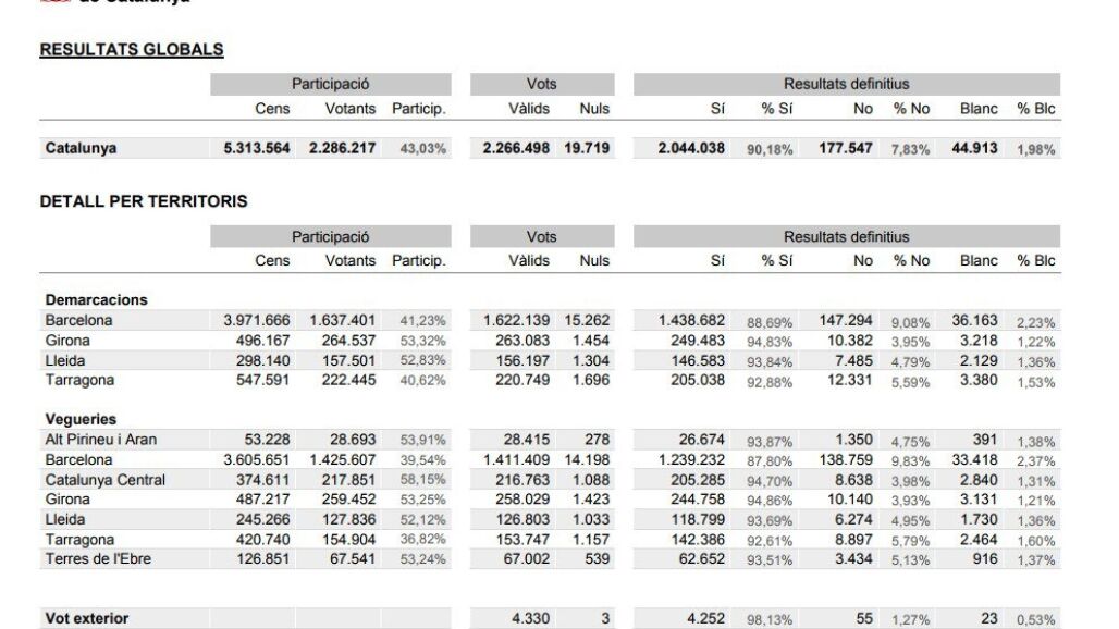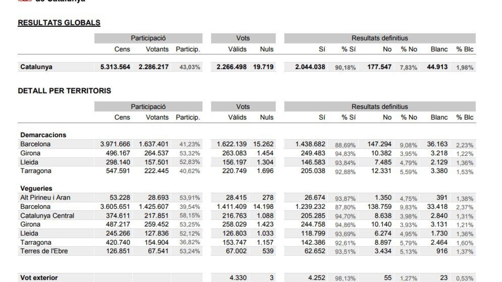 Según los resultados del recuento final basado "en papeletas verificadas y no secuestradas", el 'sí' a la independencia obtuvo 2 millones de votos: el 88,69% en Barcelona, el 94,83% en Girona, el 93,84% en Lleida y el 92,88% en Tarragona. La participación fue del 43%.