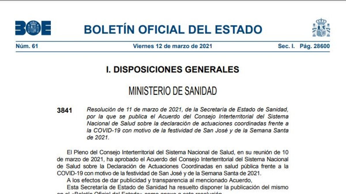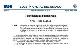 Consulta el Boletín Oficial del Estado (BOE) publicado hoy, 12 de marzo de 2021, en el que se recogen las restricciones a la movilidad por el coronavirus en las comunidades autónomas durante la Semana Santa y el puente de San José acordadas en el Consejo Interterritorial del Sistema Nacional de Salud.