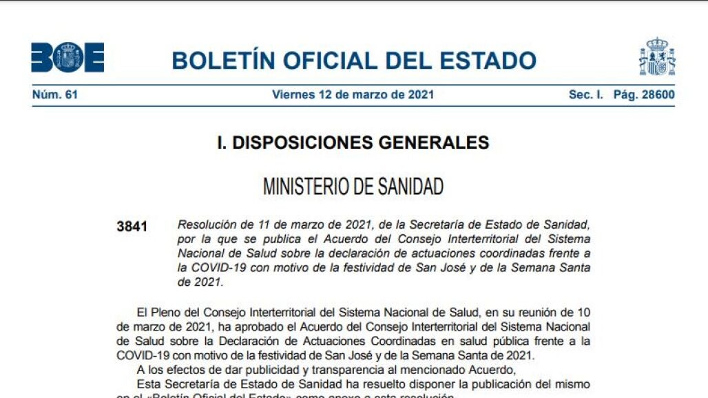 BOE de hoy 12 de marzo sobre las restricciones en Semana Santa y el puente de San José en PDF