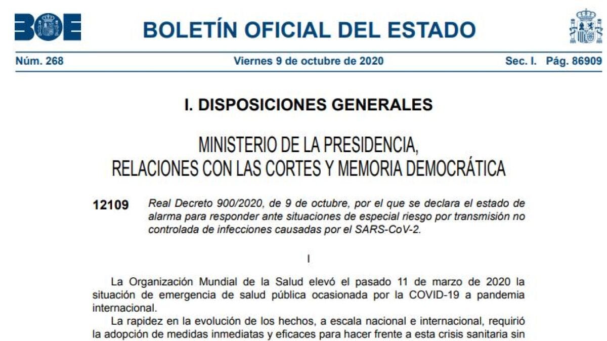 El estado de alarma ha sido aprobado en un Consejo de Ministros extraordinario, presidido por Carmen Calvo, y el decreto ha sido recogido en el BOE de hoy 9 de octubre de 2020.