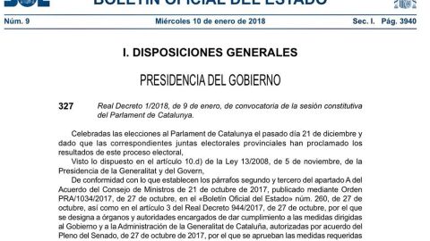 El Boletín Oficial del Estado ha publicado este miércoles el real decreto de convocatoria de la sesión constitutiva del Parlament de Cataluña, que tendrá lugar el 17 de enero a las 11.00 horas en el Palau del Parlament.