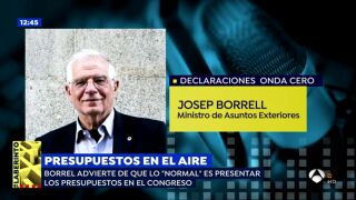En una entrevista en Onda Cero, el titular de Exteriores ha admitido que presentar el proyecto es el "proceso general" que normalmente se sigue, pero ha reconocido que el Ejecutivo vive "circunstancias poco normales". "Lo normal es presentar los presupuestos y que la Cámara se pronuncie, es el gran momento de debate político, pero depende también de las actitudes del resto de partidos y de la respuesta que de la UE a las cuentas", ha admitido Borrell.