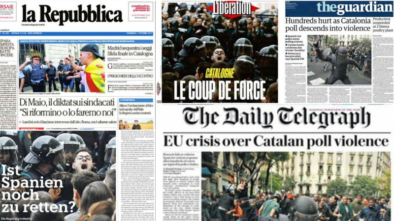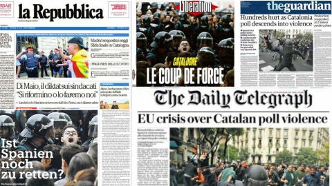 Las cargas policiales de la Policía Nacional y la Guardia Civil para intentar evitar la votación en el referéndum independentista convocado por la Generalitat de Cataluña ilustran buena parte de las portadas de este lunes de los principales rotativos europeos.